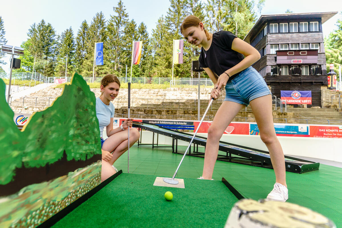 Mit viel Liebe zum Detail präsentieren wir Dir unsere kleine, aber feine Minigolfanlage im harztypischen Gewand. Schnapp Dir einen Minigolfschläger und entdecke auf unserem Parcours unter anderem die Kalte Bode, den Ottofelsen, die Teufelsmauer und als Höhepunkt natürlich unsere Arena en miniature. Lass Dich überraschen!